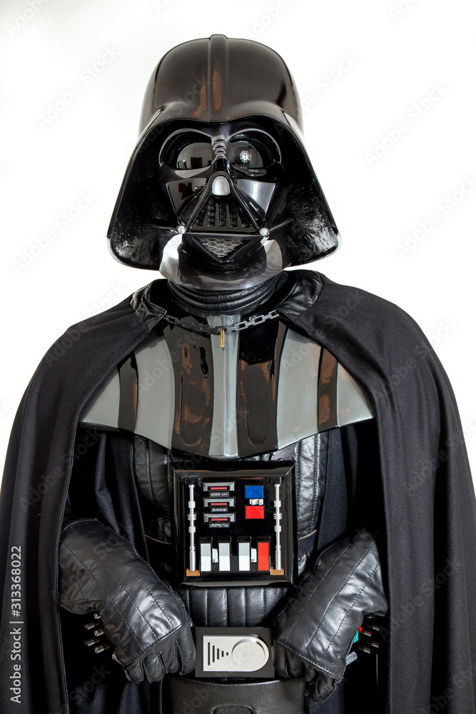 Darth Vader, the iconic Sith Lord from the Star Wars franchise, is often depicted against a striking white background that emphasizes his imposing figure and the contrast of his black armor. This visual choice highlights the complexity of his character—somewhat of a villain, yet a tragic hero. A design element expressing power and darkness amid light.